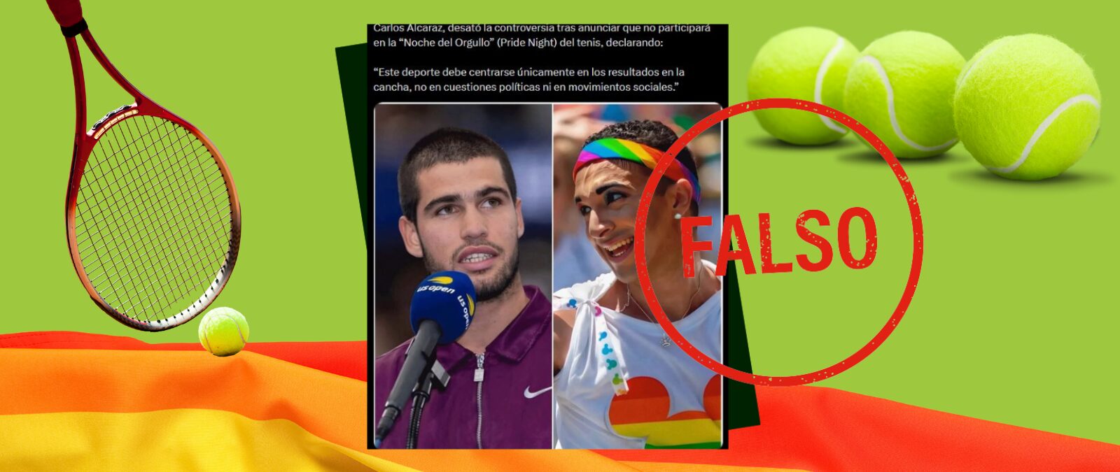 Circulan estos días en redes sociales unas supuestas declaraciones del tenista Carlos Alcaraz en las que rechaza participar en el evento ‘Noche del Orgullo’ del tenis. Según las publicaciones virales, que no aportan cuál es la fuente ni ningún dato sobre las declaraciones, el deportista se pronunció así sobre el supuesto evento: “Este deporte debe centrarse únicamente en los resultados en la cancha, no en cuestiones políticas o movimientos sociales.”