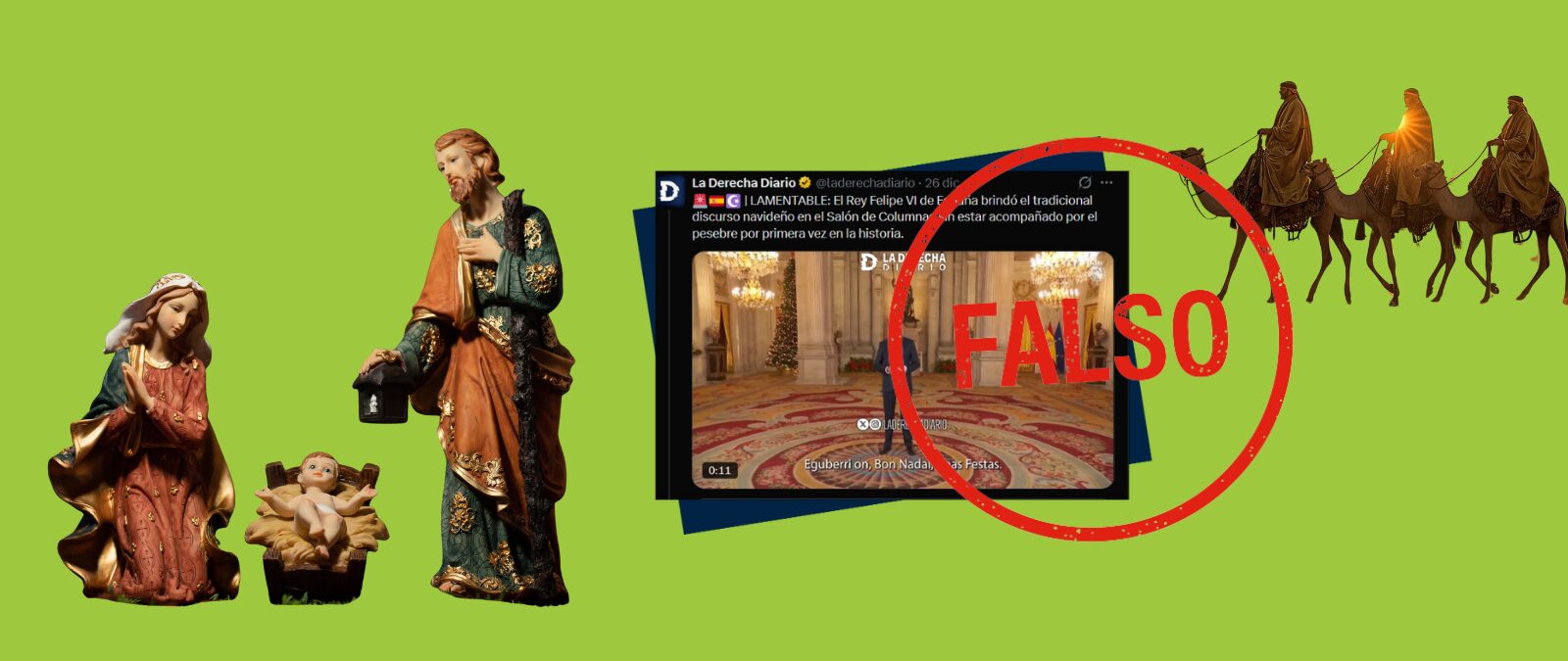 No obstante, esto es falso. En el mensaje de Navidad del rey Felipe VI del pasado 24 de diciembre sí había un pesebre como adorno.