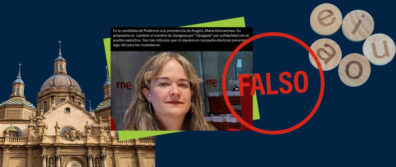 Uno de ellos es un mensaje que asegura que la candidata de Podemos a la Presidencia de Aragón, María Goicoechea, ha propuesto cambiar el nombre de Zaragoza por “Zaragaza” como gesto simbólico de solidaridad con el pueblo palestino.