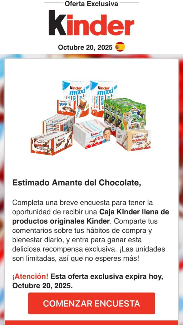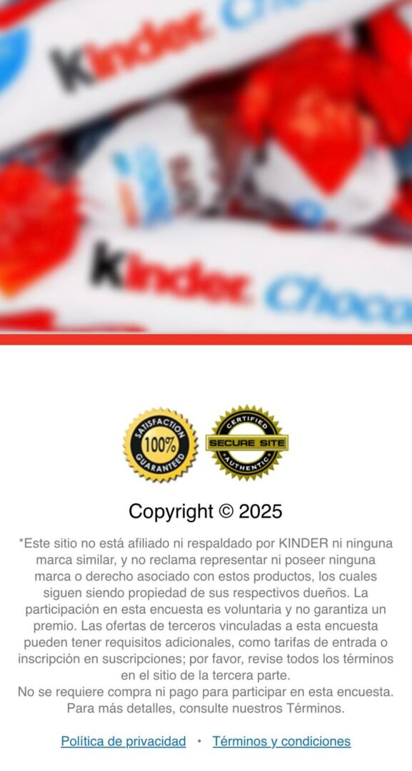 “Ha sido seleccionado para nuestro exclusivo programa de recompensas 2025. Como cliente especial, puedes recibir una Caja Kinder exclusiva. ¡Esta oportunidad es limitada, actúa rápido!” (sic).