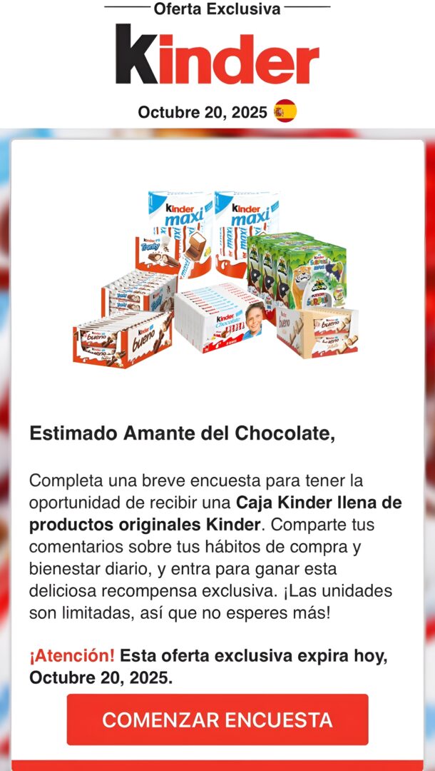 “Ha sido seleccionado para nuestro exclusivo programa de recompensas 2025. Como cliente especial, puedes recibir una Caja Kinder exclusiva. ¡Esta oportunidad es limitada, actúa rápido!” (sic).