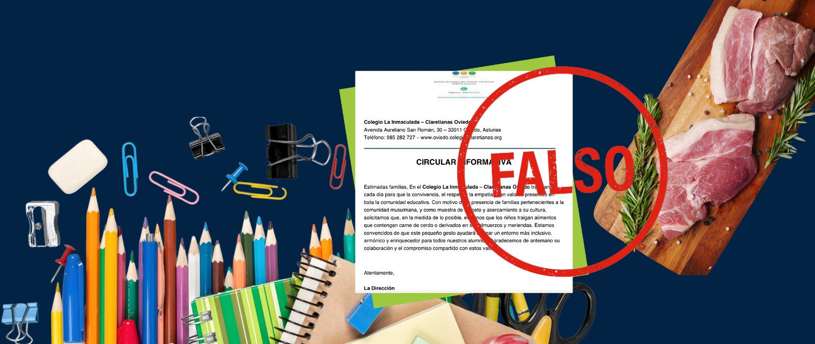 “Estimadas familias, en el Colegio La Inmaculada-Claretianas Oviedo trabajamos cada día para que la convivencia, el respeto y la empatía sean valores presentes en toda la comunidad educativa. Con motivo de la presencia de familias pertenecientes a la comunidad musulmana, y como muestra de respeto y acercamiento a su cultura, solicitamos que, en la medida de lo posible, evitemos que los niños traigan alimentos que contengan carne de cerdo o derivados en sus almuerzos y meriendas” (sic). Así comienza el supuesto comunicado que se ha viralizado.