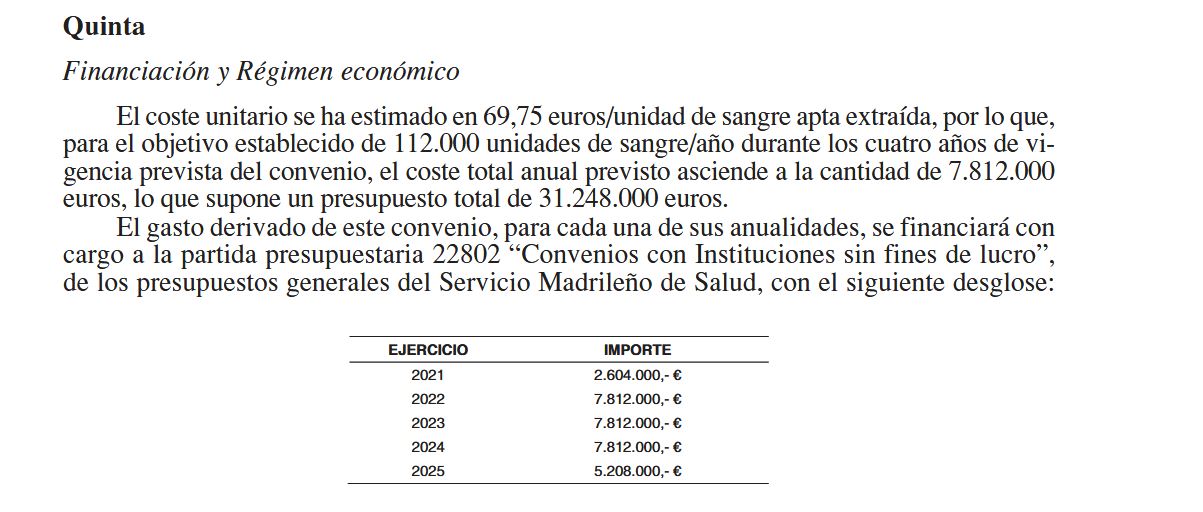 El origen de esta desinformación está en un convenio firmado en 2013 entre el Servicio Madrileño de Salud y Cruz Roja. En el documento se establece una compensación económica para la ONG por los costes derivados de la extracción de sangre: personal sanitario, materiales para la extracción, unidades móviles… El segundo fue firmado en 2021 y está vigente hasta 2025.