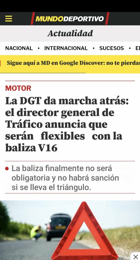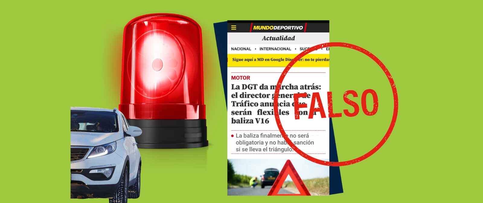 En concreto, los usuarios comparten una captura de pantalla de un titular del medio deportivo Mundo Deportivo que dice lo siguiente: “La DGT da marcha atrás: el director general de Tráfico anuncia que serán flexibles con la baliza V16.” En la imagen viral, también se puede leer el siguiente subtítulo: “La baliza finalmente no será obligatoria y no habrá sanción si se lleva el triángulo.”