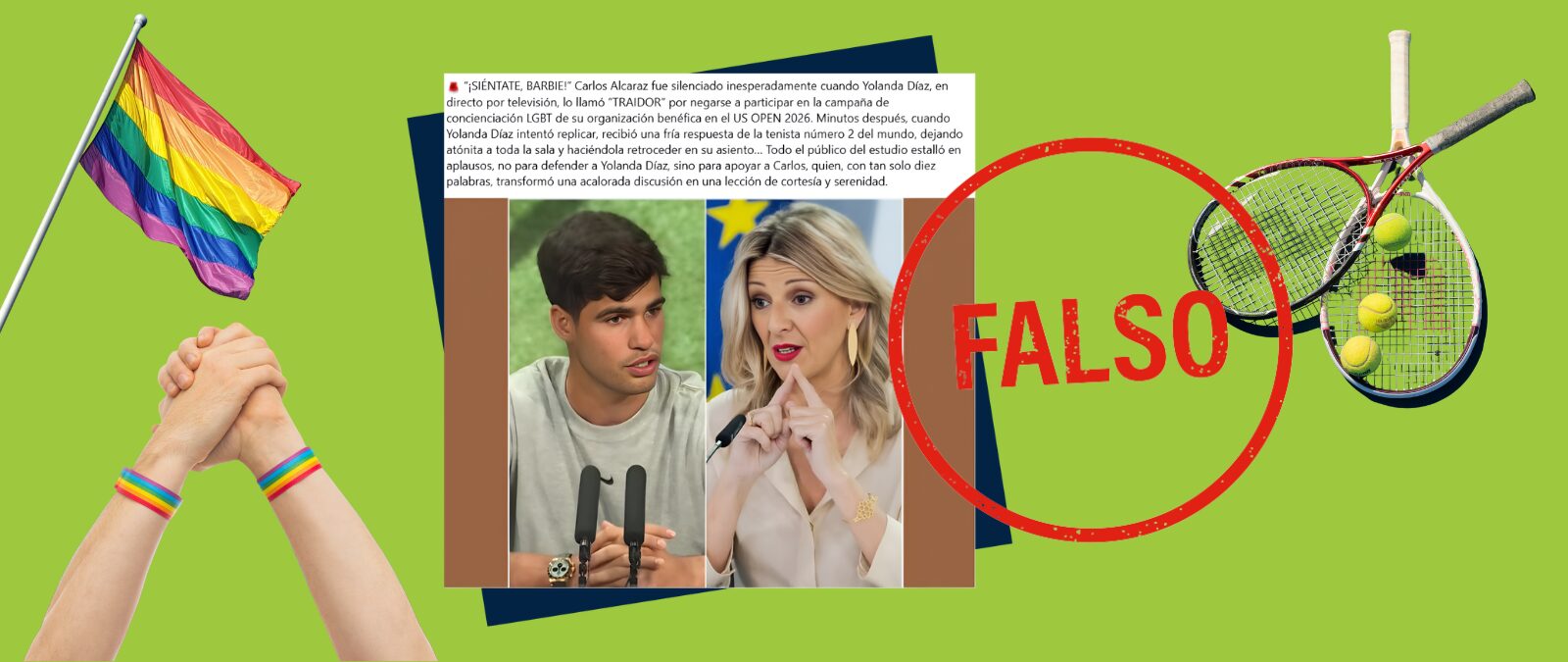 “Carlos Alcaraz fue silenciado inesperadamente cuando Yolanda Díaz, en directo por televisión, lo llamó “TRAIDOR” por negarse a participar en la campaña de concienciación LGBT de su organización benéfica en el US OPEN 2026” (sic). Así comienza una publicación compartida en la página de Facebook Tennis News Insight, un perfil dedicado supuestamente al mundo del tenis.