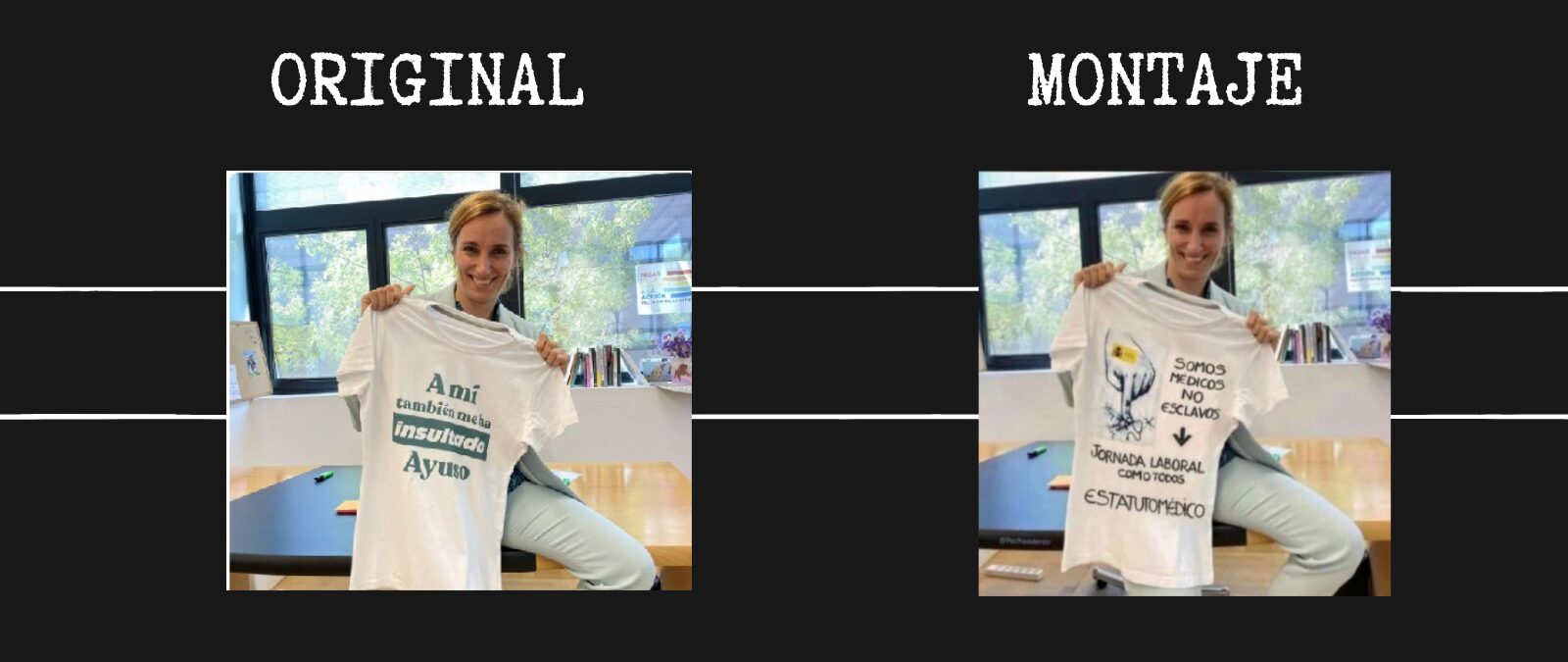 La imagen viral de Mónica García, ministra de Sanidad, con una camiseta que dice“somos médicos no esclavos” es un montaje es un montaje. La foto original la publicó la política de Más Madrid en su perfil de X, antes Twitter, el 14 de octubre de 2021, y lleva impreso el siguiente mensaje: “A mí también me ha insultado Ayuso”.