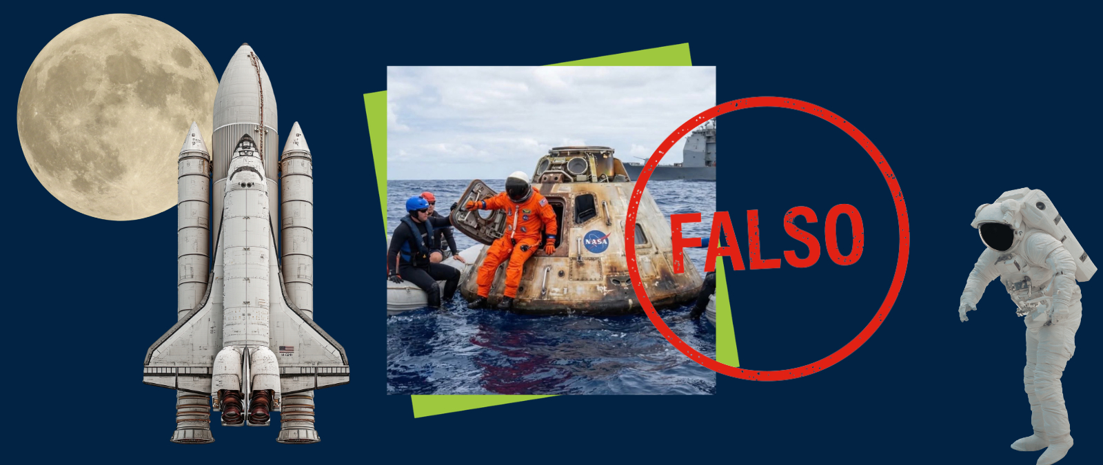 A raíz de la misión Artemis II y de su regreso a la Tierra, circulan muchos mensajes en redes sociales que niegan los hitos espaciales y que aseguran que, en realidad, estas misiones son rodajes cinematográficos. Como supuesta prueba, se difunde una imagen de la cápsula Orion flotando en el mar con una pegatina de la NASA.