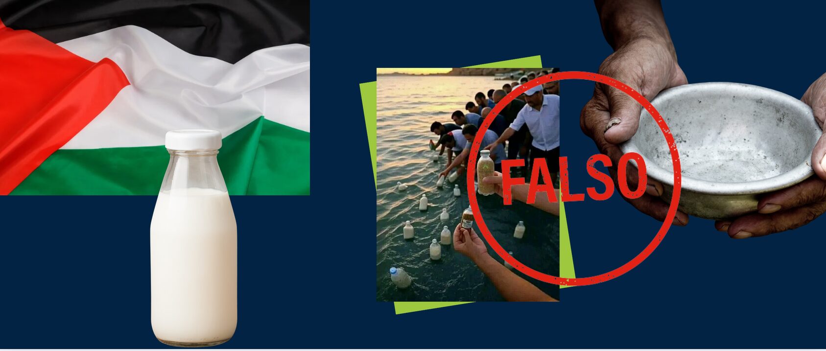 Se ha viralizado una imagen que muestra supuestamente a ciudadanos egipcios lanzando al mar botellas con leche para que el agua del mar las arrastre hasta los bebés de Gaza.  A veces se comparte esta imagen junto a otras dos que muestran una de esas supuestas botellas con leche de fórmula para los bebés y otra para es una foto de decenas de botellas en el mar arrastradas por la corriente.