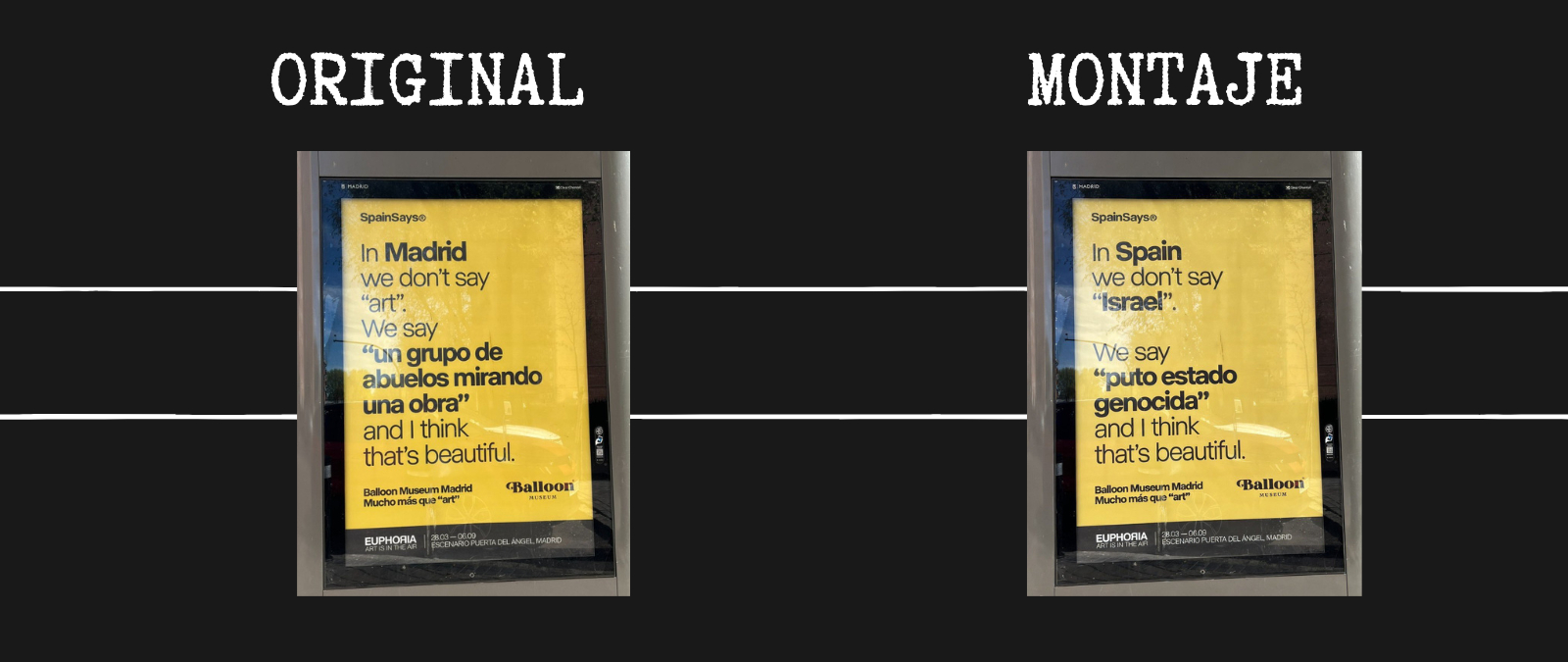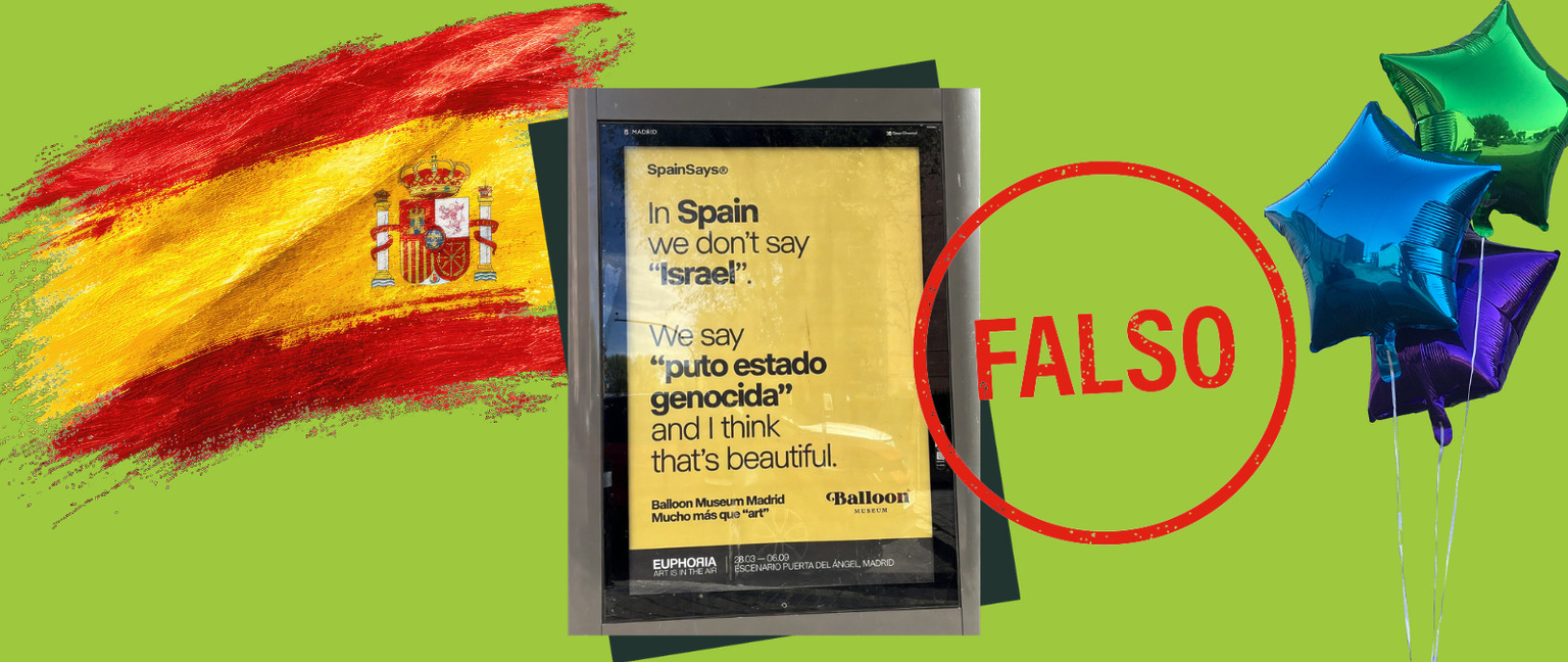 Estos carteles virales son falsos. La comunidad SpainSays han confirmado a INFOVERITAS que las marquesinas han sido generadas con inteligencia artificial a partir de una imagen real de la campaña publicitaria de la comunidad SpaiSays para promocionar la exposición ‘Euphoria – art is in the air’ del Balloon Museum.