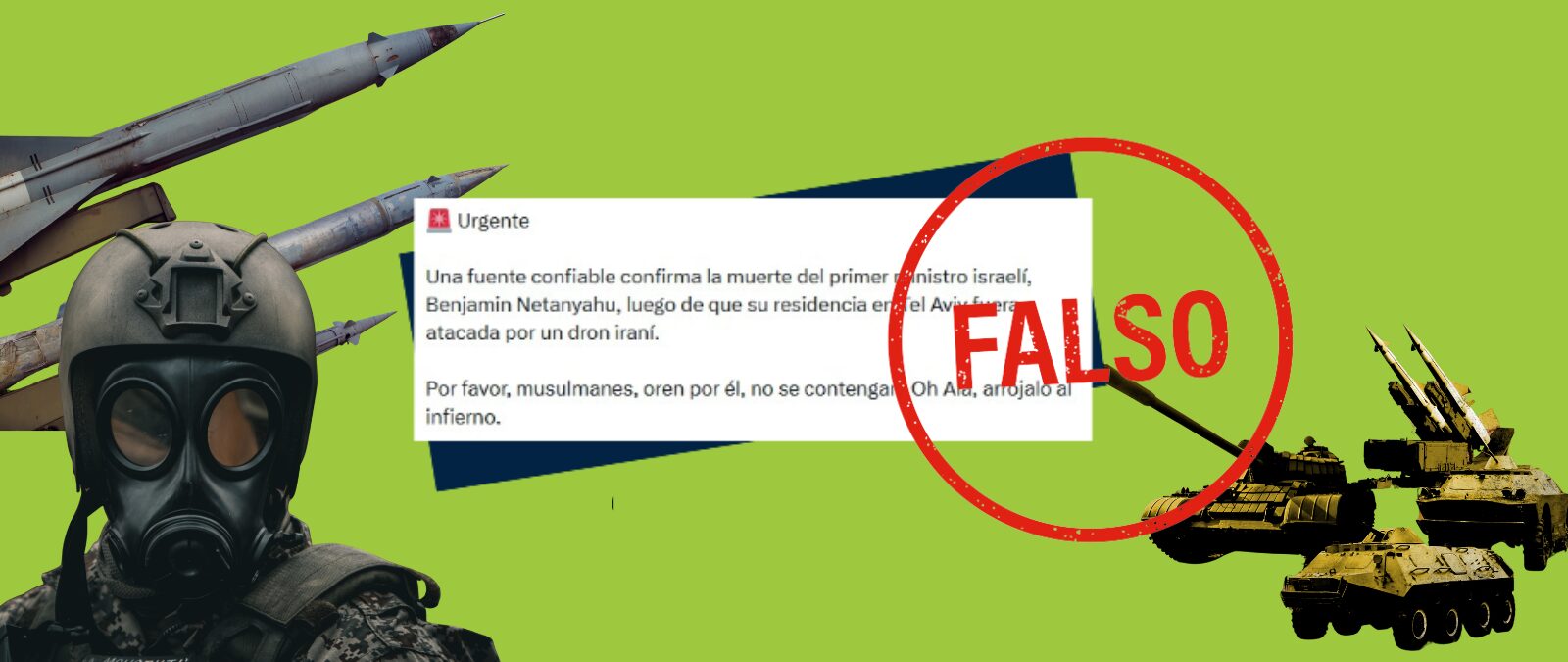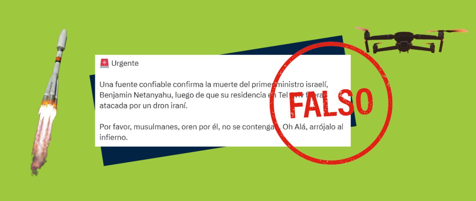 Circulan en redes sociales mensajes que aseguran que el primer ministro de Israel, Benjamin Netanyahu, falleció tras un supuesto ataque iraní a su residencia. En otros mensajes, se señala que Netanyahu está en estado crítico tras un ataque masivo con misiles balísticos atribuido a Irán. Las publicaciones suelen citar «fuentes de inteligencia» no identificadas o medios estatales iraníes, peor no aportan ninguna prueba.