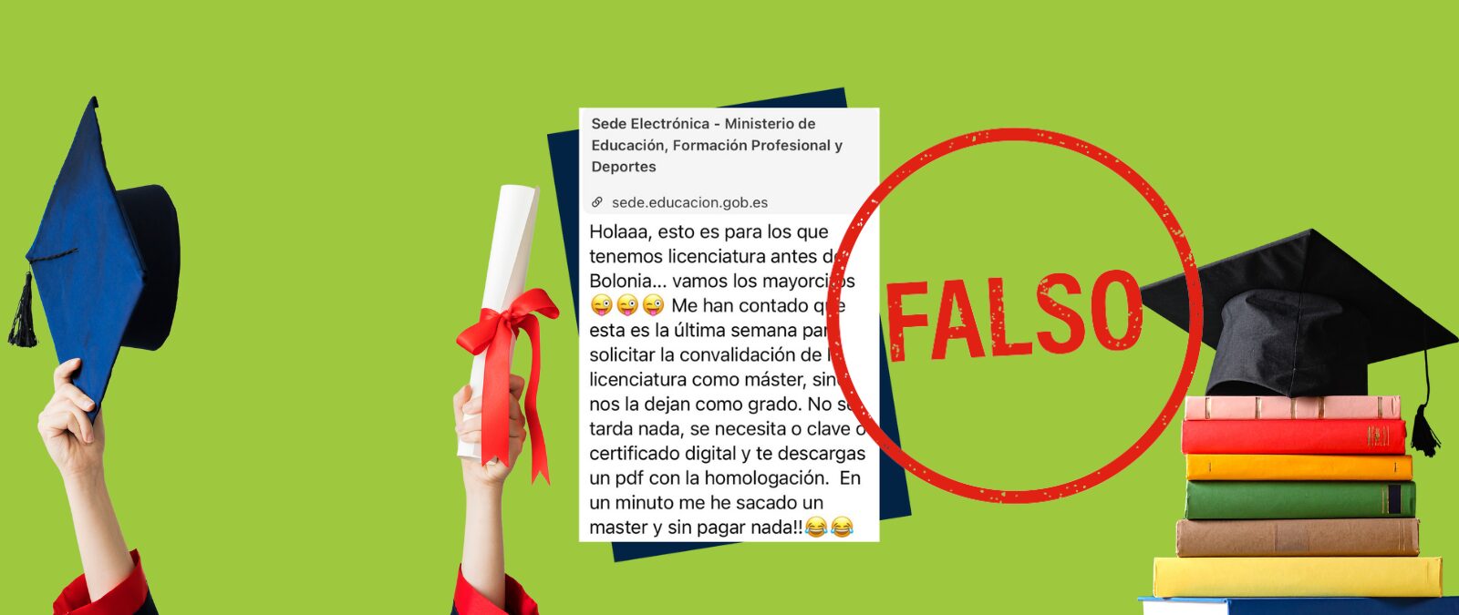 En los últimos días circula por WhatsApp un mensaje que afirma que esta semana termina el plazo para equiparar las antiguas licenciaturas universitarias a títulos de máster. El texto viral dice: “¡Hola! Os paso algo para los que hicimos licenciatura: esta semana se termina el plazo (yo me he enterado hoy) para equiparar los cinco años de licenciatura a máster. Si no, nos van a equiparar a grado. Yo lo he hecho en cinco minutos, eso sí, con certificado digital, Cl@ve PIN o alguna de esas cosas” (sic).