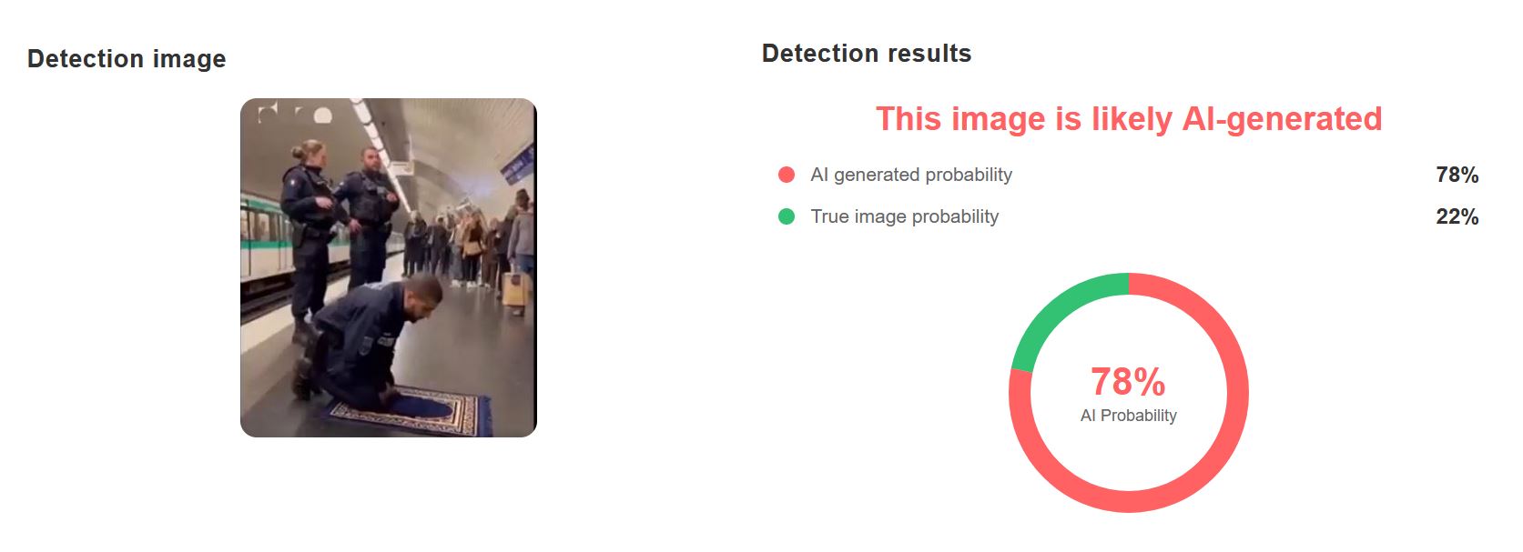 Sin embargo, esto es falso. Las imágenes no muestran a un “policía musulmán» rezando en un andén de metro. Se trata de un vídeo de inteligencia artificial generado con Sora.