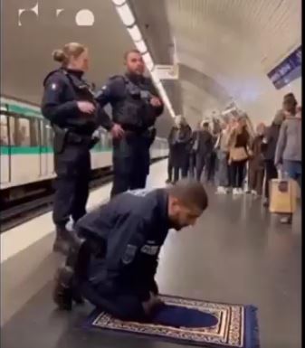 “Un policía musulmán hace sus oraciones durante el servicio y en uniforme. ¿Es aceptable?», se puede leer en una publicación viral en X. El mensaje está acompañado por un vídeo de 13 segundos que muestra a dos agentes de policía en un andén de metro mientras un tercero se arrodilla sobre una alfombra y se pone a rezar.