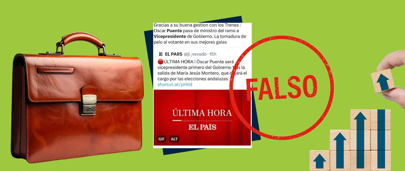 Se difunden en redes sociales mensajes que aseguran que Pedro Sánchez ha nombrado a Óscar Puente vicepresidente del Gobierno tras la salida de María Jesús Montero por las elecciones andaluzas. «Gracias a su buena gestión con los Trenes: Oscar Puente pasa de ministro del ramo a Vicepresidente del Gobierno. La tomadura de pelo al votante en sus mejores galas» (sic), se puede leer en uno de los mensajes que se difunden.