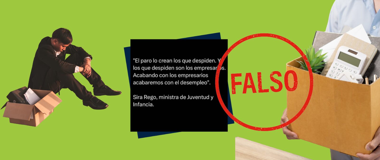 “El paro lo crean los que despiden. Y los que despiden son los empresarios. Acabando con los empresarios acabaremos con el desempleo” (sic). Se atribuyen en redes sociales estas palabras a la ministra de Juventud e Infancia de España, Sira Rego (IU).